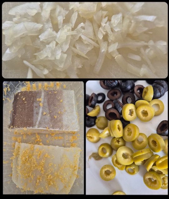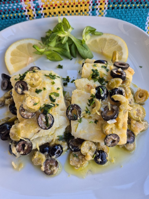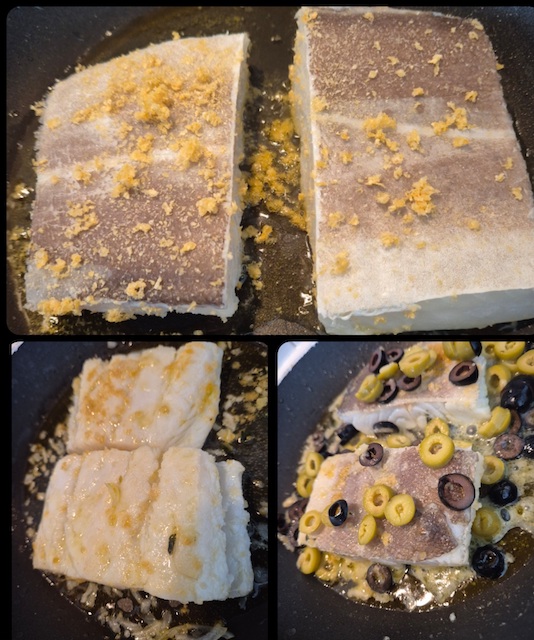 Frullare le gallette fino a renderle farina.Sciacquare bene il Baccalà, asciugarlo e passarlo nella farina di gallette appena preparata.In una padella scaldare l'olio e far dorare il Baccalà prima dalla parte della polpa e poi dalla parte della pelle.Aggiungere la cipolla tritata e lasciare insaporire un paio di minuti prima di unire le olive tagliate a rondelle. Versare quindi il succo di mezzo limone e un po' di pepe.Cuocere a fuoco moderato per 15 minuti.Affinché il piatto risulti più saporito e morbido versare ogni tanto sul pesce il proprio sugo di cottura.Se necessario girare i filetti con molta cautela per evitare di romperli.In linea di massima non dovrebbe servire il sale e quindi aggiustarlo solo dopo aver assaggiato.A fine cottura insaporire con un pizzico di buccia di limone grattugiata, un cucchiaino di prezzemolo tritato e ... gustare ben caldo.