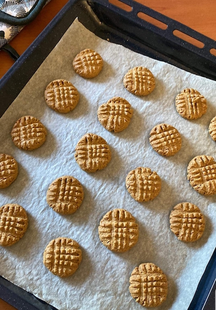 In una ciotola unire tutti gli ingredienti e mescolare bene.Con il composto ben miscelato formare delle palline e sistemarle un po' distanziate su una capiente teglia rivestita di carta forno.Con i rebbi di una forchetta schiacciare le palline nei due sensi come guarnizione e per dar loro la forma di biscotto.Cuocere 10 minuti in forno già preriscaldato a 170 ° in modalità ventilato.