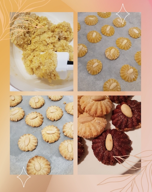Passarle sulla farina di mandorle, schiacciarle leggermente (o con le mani o con qualche stampino) e sistemarle su una teglia capiente foderata da carta forno.