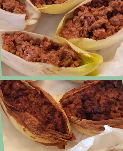 Preparare 6 barchette di insalata (ogni barchetta sarà formata da 3 foglie di verdura per poter contenere il ripieno).