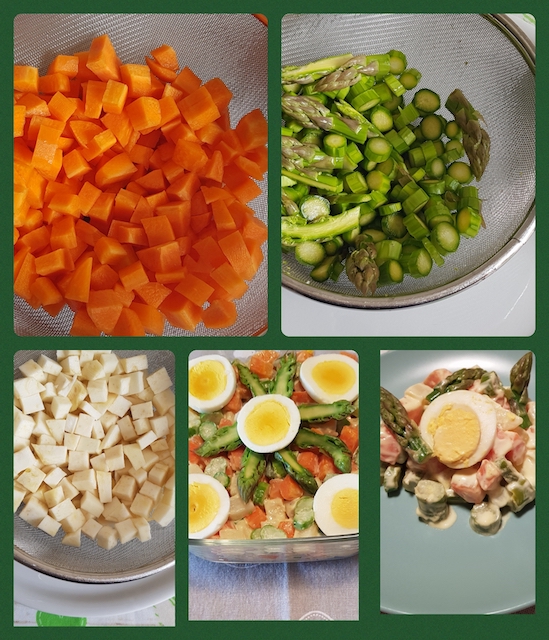 Gli asparagi andranno tagliati a rotelline della misura dei cubetti, mentre le punte per la guarnizione, lunghe circa 3 cm, potranno essere tenute intere o tagliate a metà nel senso della lunghezza.