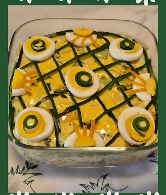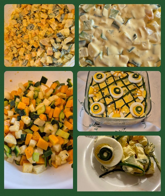 Compattare bene le verdure e coprire con la Maionese tenuta da parte.Decorare con verdure a piacere e con l'uovo sodo tagliato a fettine, o a spicchietti. La decorazione in foto è realizzata con spaghetti di zucchine sbollentati una ventina di secondi. Devono rimanere sodi e verdi brillanti.