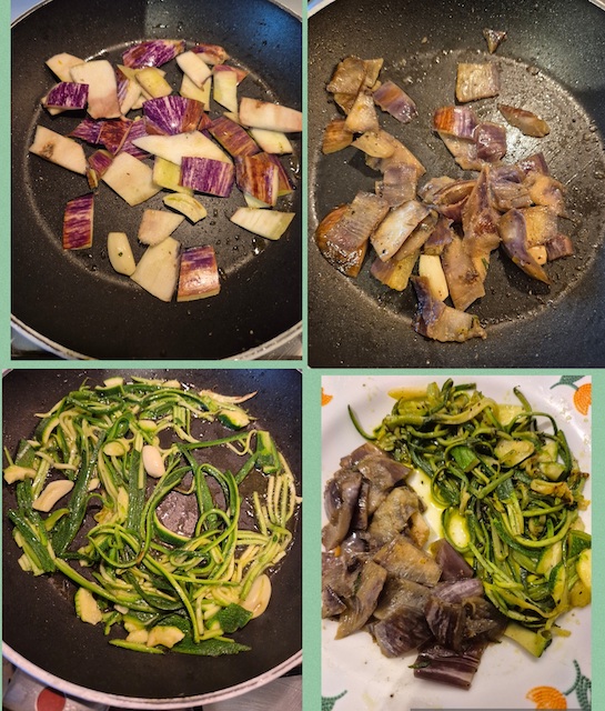 - Pelare le Zucchine tagliando a listarelle la parte verde (conservare la parte bianca). Far saltare per circa 5 minuti le listarelle verdi con un goccino di olio, uno spicchio d'aglio e un pizzico di sale e pepe nella stessa padella usata per la buccia di melanzana al funghetto. Tenere da parte anche queste listarelle saltate.