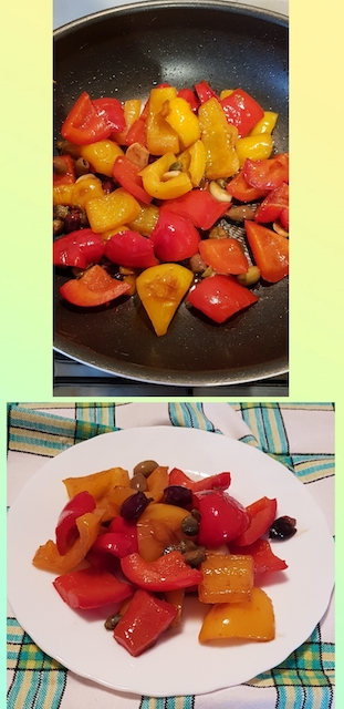 Coprire quindi la pentola, abbassare il fuoco e continuare la cottura per circa 15 minuti mescolando ogni tanto con delicatezza per non romperli. I peperoni dovranno risultare cotti ma saldi.