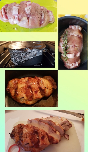 Salare e pepare il petto di pollo appena pancettato e sistemarlo in un tegame adatto al forno.Spremere il limone e la mezza arancia; versare il succo sul pollo, aggiungere il rosmarino e lasciare marinare per almeno mezz'ora coprendo con un foglio di alluminio.