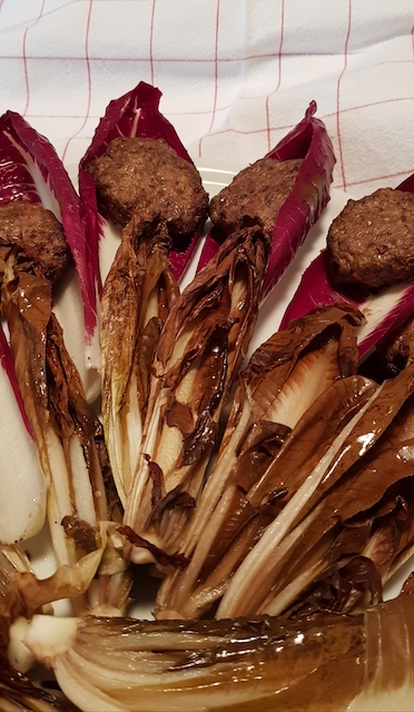 Adagiare su ogni foglia cruda di radicchio una polpetta e completare il piatto anche con il radicchio arrostito.
