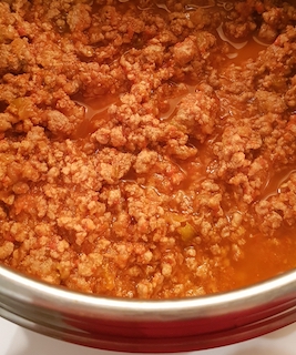 Scaldare la pentola a pressione (o quella che si preferisce) e rosolare la carne macinata e quando sarà completamente asciugata spruzzarla con un paio di cucchiai di aceto rosso (fare attenzione che non contenga zucchero).
