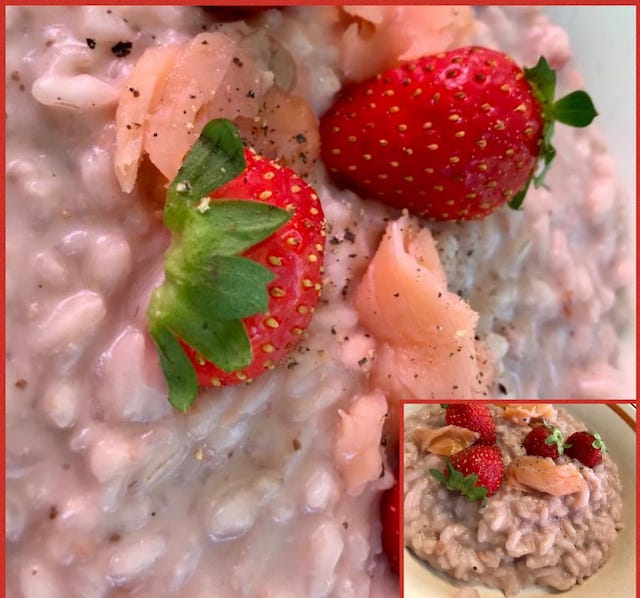 Riaccendere il fuoco e aggiungere quindi il resto di Fragole e Salmone tagliati in piccoli pezzi, unire il cucchiaio di Mascarpone (o ricotta o Burro) e mantecare un minuto a fuoco dolce. Per ultimo unire il Parmigiano grattugiato, aggiustare di Sale, Pepe ed eventualmente aggiungere un po' di liquido (brodo o acqua) bollente per terminare la mantecatura.