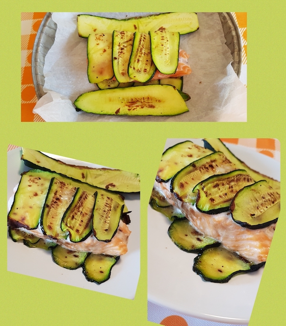 Tagliare la zucchina in fette dello spessore di circa 3 mm. Nel senso della lunghezza.Salarle, peparle e lasciarle marinare così per circa 20 minuti in modo che perdano l'acqua.Trascorso questo tempo asciugare le fette di zucchina con della carta e grigliare per 3 o 4 minuti.Stendere le fette su una teglia foderata di carta forno leggermente sovrapposte, adagiarvi il salmone e chiuderlo con le fette come in un abbraccio.Aggiustare di sale e pepe e cuocere in forno o in friggitrice ad aria già calda a 180° per circa 15 minuti.