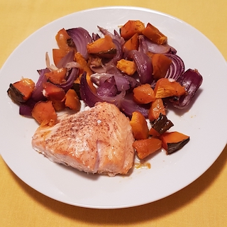 Preparare la zucca e la cipolla lavate e tagliate a pezzi di media grandezza e metterle nella teglia.