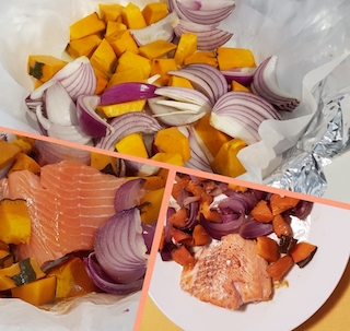 Trascorso questo tempo mescolare le verdure, aggiungere il salmone, aggiustare di sale e pepe e continuare la cottura per altri 15 minuti circa.