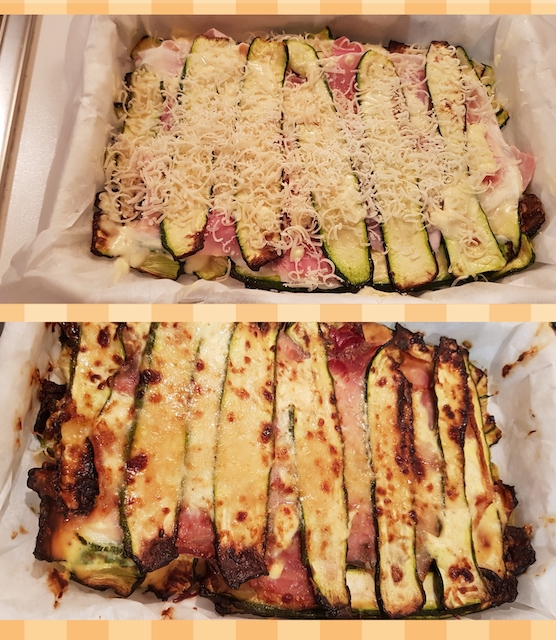 Lavare e tagliare le zucchine a fette, nel senso della lunghezza, con spessore di 2 mm circa. Con l'aiuto di una mandolina risulteranno tutte uguali.Sistemarle in un contenitore e farle marinare per circa mezz'ora con un po' di sale affinché rilascino l'acqua in eccesso.Trascorso questo tempo sciacquarle, asciugarle e ungerle con un cucchiaio di olio evo utilizzando le mani per distribuirlo uniformemente.Adagiare le fettine, senza che si sormontino, in friggitrice ad aria o nella leccarda del forno foderata da carta forno e cuocerle a 180 ° per 10 / 15 minuti. La friggitrice ad aria cuoce più velocemente del forno normale e quindi in entrambi i casi monitorare la cottura.Nel frattempo unire in una ciotola la ricotta, l'uovo, un po' di pepe e mescolare bene fino ad ottenere una crema vellutata ed omogenea.A questo punto si può iniziare a comporre lo sformato in una teglia rettangolare rivestita di carta forno.Procedere con i vari strati alternando zucchine, un velo di crema, prosciutto cotto, parmigiano grattugiato e un pizzico di pepe secondo i propri gusti.Completati gli strati infornare, nel forno normale o in friggitrice ad aria se la teglia ci sta, a 180°, per i primi 20 minuti con teglia coperta da un foglio di alluminio e poi scoperta finché la superficie non sarà ben gratinata.Lo sformato dovrebbe risultare adeguatamente saporito grazie al parmigiano, al prosciutto e alla marinatura delle zucchine con il sale. Aggiustare di sale, quindi, solo dopo l'assaggio.Lo sformato sarà buono consumato subito ma il giorno dopo risulterà anche migliore.