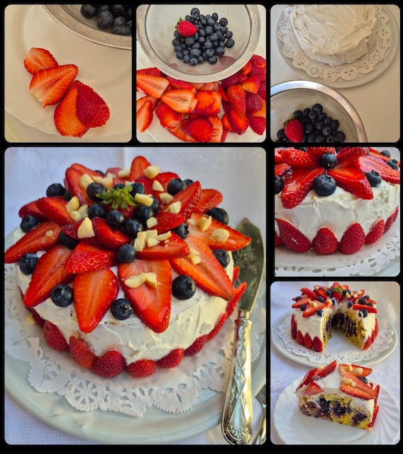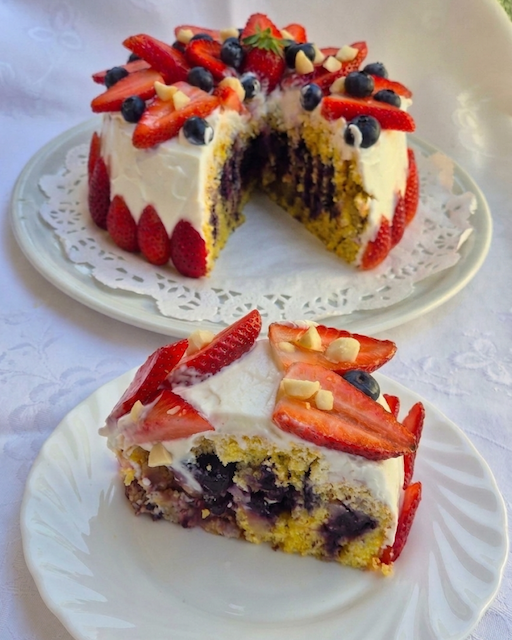 • Decorare a piacere la superficie della torta con le fragole e i mirtilli.