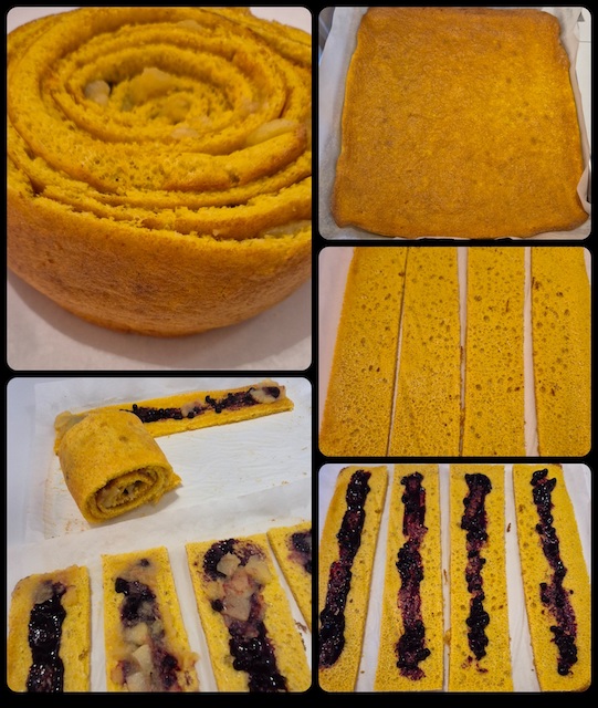 • Una volta cotta, staccare delicatamente la pasta biscotto dalla carta e lasciarla riposare qualche minuto. Rifilare i bordi per ottenere rettangoli precisi e tagliarli in strisce larghe 7 cm. (o della misura esatta per poter suddividere il proprio rettangolo di pasta biscotto).